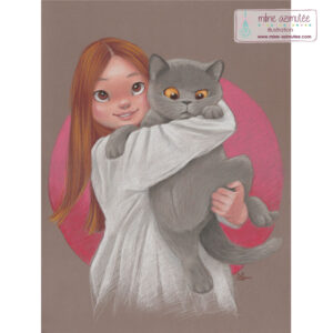 Affiche enfant personnalisée, dessin au pastel sec – « Chat et son doudou »