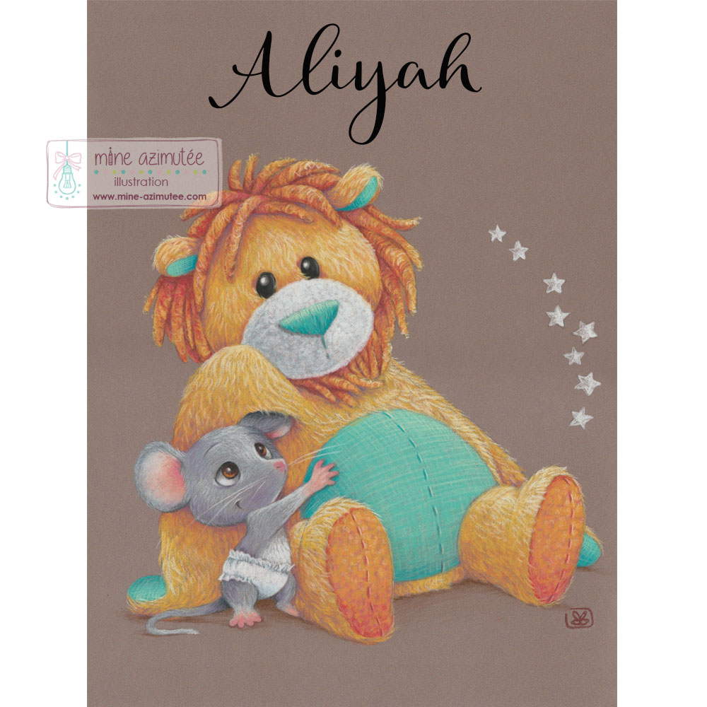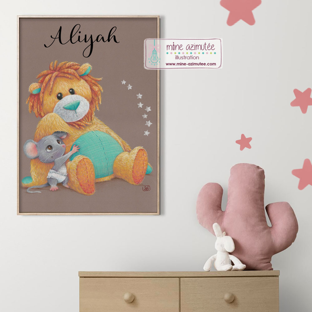 Affiche enfant personnalisée, dessin au pastel sec – « Souris et son doudou »